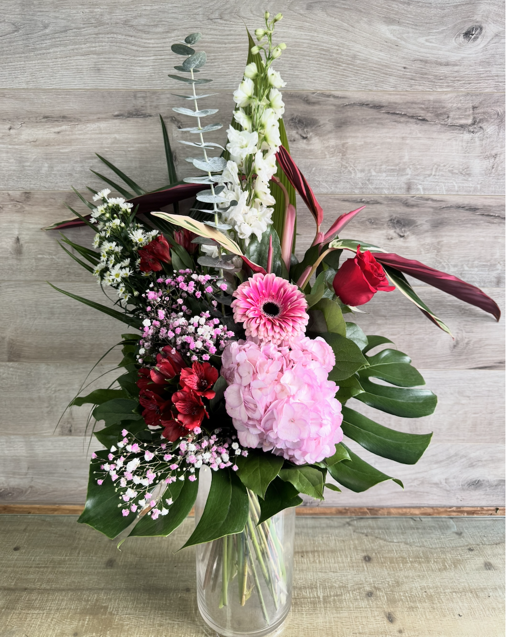 Superbe bouquet en hauteur doté de magnifiques fleurs roses avec une touche champêtre. Convient pour toutes occasions! Le vase n’est pas inclus!
