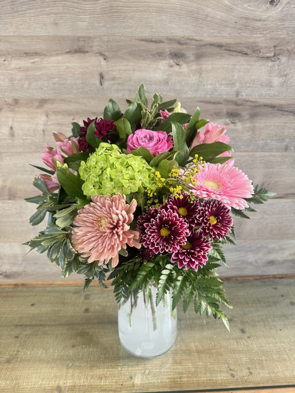 Un arrangement vibrant et rempli de caractère, mêlant des teintes framboise, vert lime et rose vif. Un bouquet énergique qui illumine la pièce et apporte une touche moderne et joyeuse.