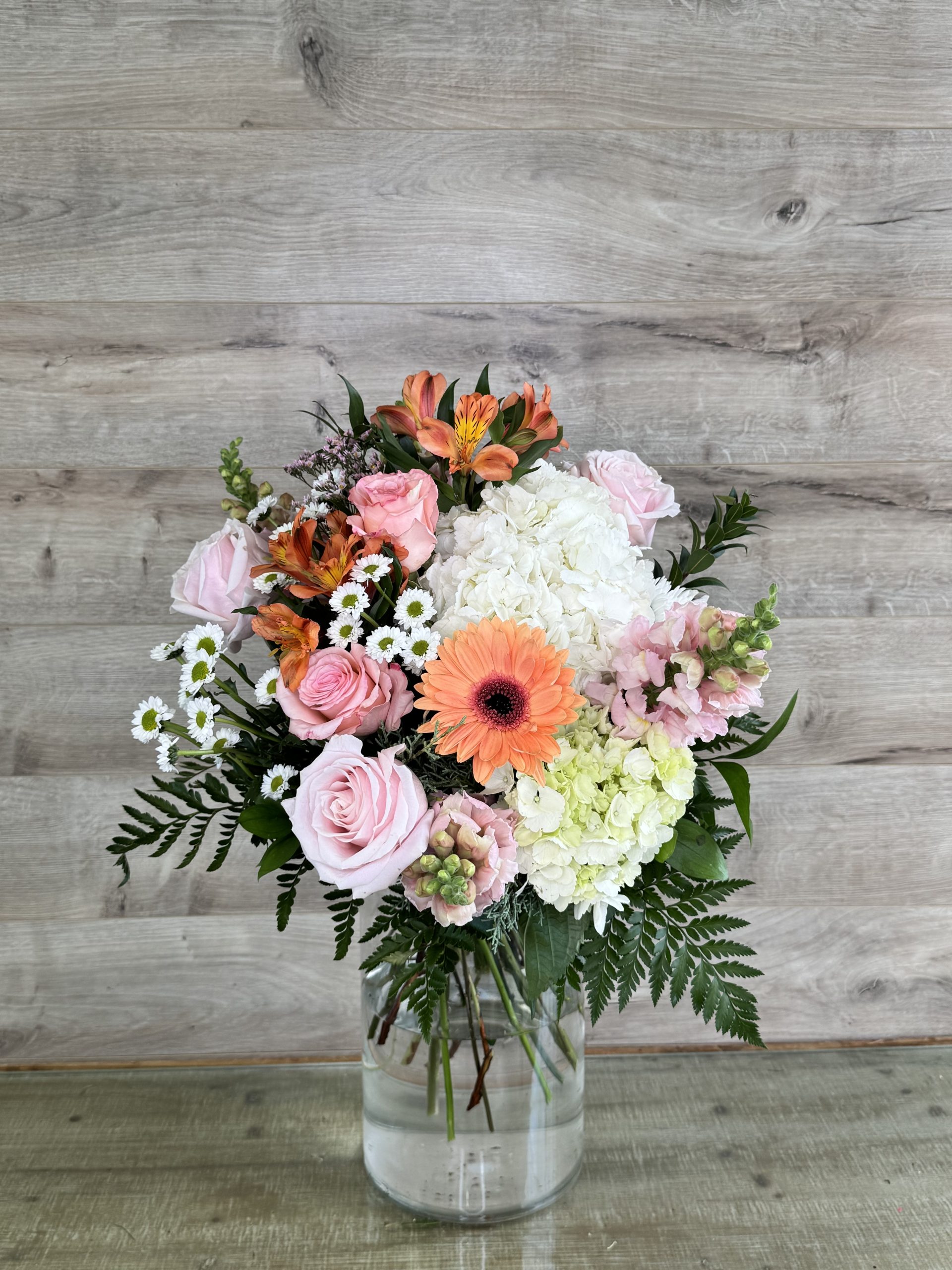 Un mélange frais et lumineux de fleurs pêche, blanches et rosées. Son gerbera orange doux et ses hydrangées crème créent une composition chaleureuse qui évoque le soleil et la bonne humeur.