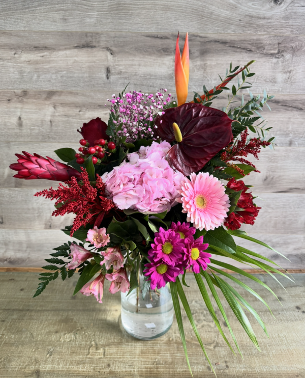 Magnifique bouquet coloré dans les teintes de rose avec une touche tropicale qui apporte un punch et de l’impact à votre bouquet. *Le vase n’est pas inclus!
