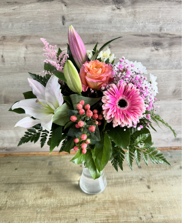Bouquet coquet avec une touche exotique munis de lys. Une touche romantique avec les teintes de rose. Convient pour toutes occasions!